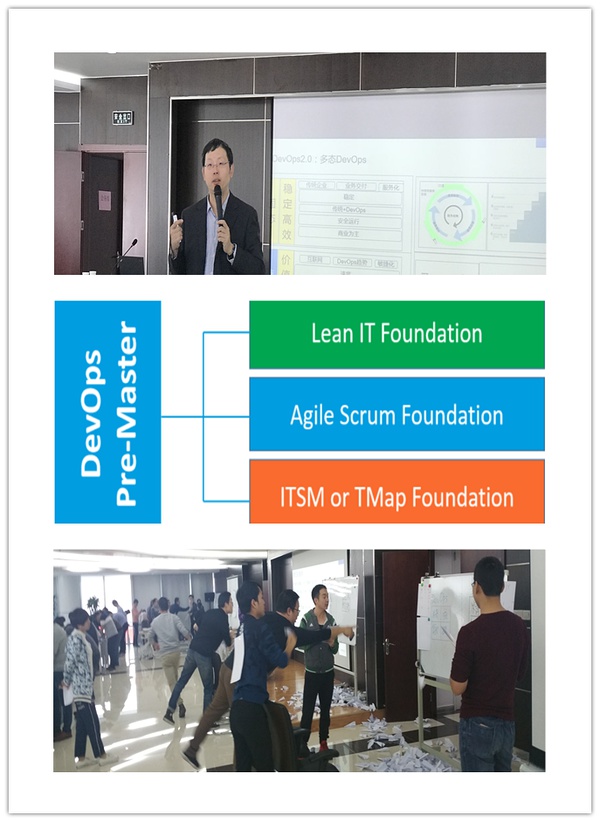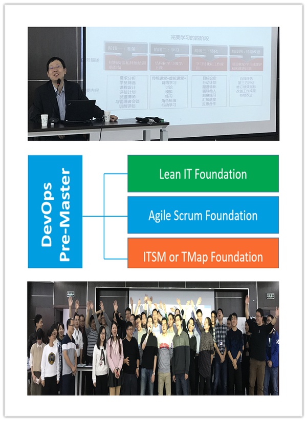 最后,北京老李从课程体系的特点到课程的特色都进行了详细的介绍。EXIN Pre-Master课程体系将促进广大IT从业者全面扎实地掌握DevOps相关领域基础知识,包括敏捷,精益IT,IT服务管理等内容,做到真正学以致用。所有完成EXIN DevOps三门系列准入认证如下图所示。